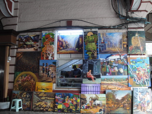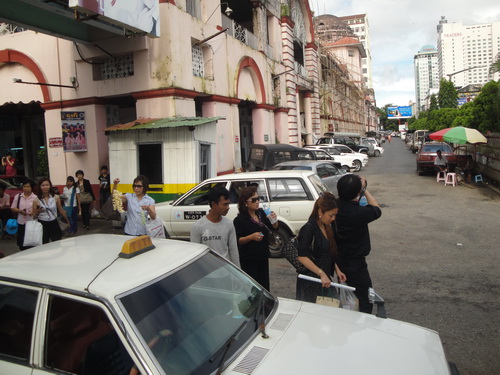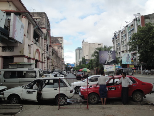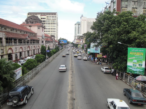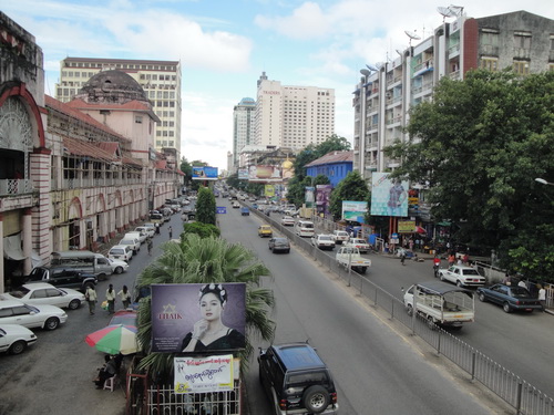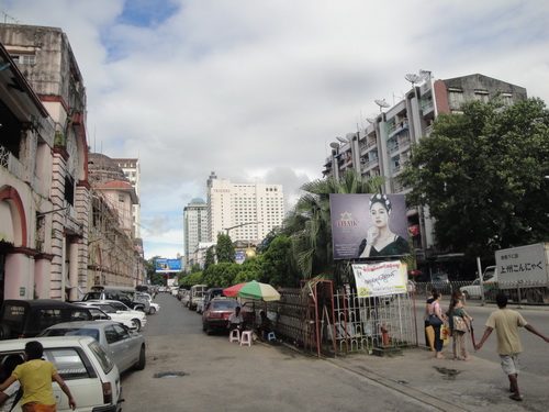 9699. ภาพนี้ดูอย่างผิวเผินก็น่าจะเหมือน เมืองบางกอก นะครับ ถ้าไม่มีผู้ชายนุ่งโสร่ง และ รถยนต์พวงมาลัยอยู่ด้านขวาวิ่งชิดด้านขวา นะครับ