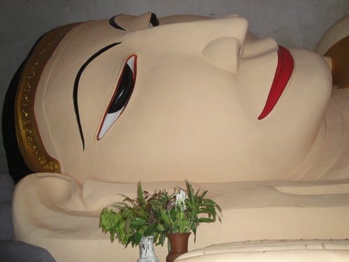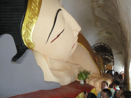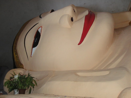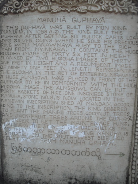 เขาว่ากันว่า (น่าจะบอกว่า ไกด์บอกว่า) พระพุทธรูปปางไสยาสน์ แห่ง วัดมนูหะ ถ้ามองไกลๆ คือ จากด้านพระบาทของพระพุทธรูปไปยังพระพักต์จะเห็นเหมือนพระพุทธรูปแย้มพระสรวล (ยิ้ม) แต่เมื่อเดินไปใกล้ๆจะเห็นเหมือนพระพุทธรูปทรงพระกรรณแสง (ร้องไห้) สะท้อนถึงกษัตริย์ผู้สร้าง คือ พระเจ้ามนูหะ(King Manuha) กษัตริย์มอญที่ถูกจับตัวมาเป็นเชลย
