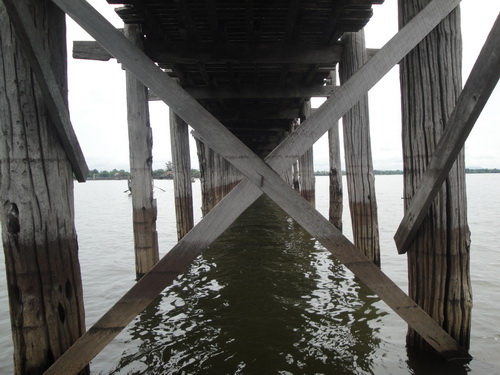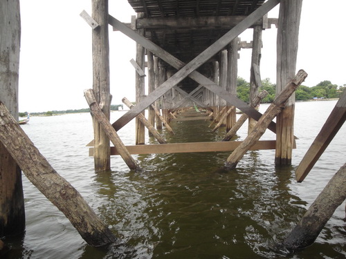 The bridge was built from wood reclaimed from the former royal palace in Inwa. It features 1,086 pillars that stretch out of the water, some of which have been replaced with concrete. Though the bridge largely remains intact, there are fears that an increasing number of the pillars are becoming dangerously decayed. Some have become entirely detached from their bases and only remain in place because of the lateral bars holding them together. Damage to these supports have been caused by flooding as well as a fish breeding program introduced into the lake which has caused the water to become stagnant. The Ministry of Culture’s Department of Archaeology, National Museum and Library plans to carry out repairs when plans for the work are finalised.[1]