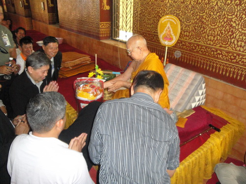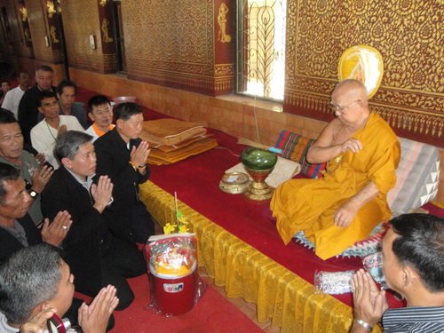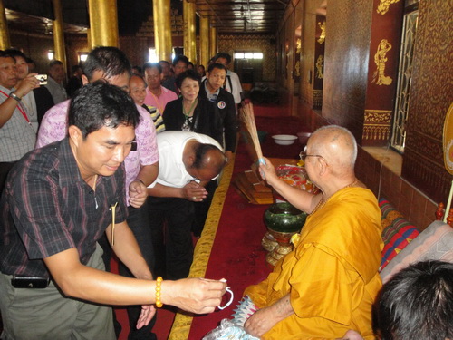8232. พระรัตนรังษี หรือ พระครูบาแสงหล้า ธมฺมสิริ เจ้าอาวาสวัดพระธาตุสายเมือง เวียงท่าขี้เหล็ก สหภาพเมียนมาร์ ประพรมน้ำมนต์เพื่อเป็นศิริมงคลแก่ คณะ พคบ.301