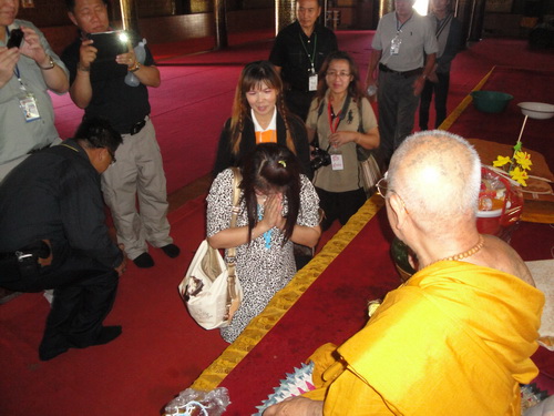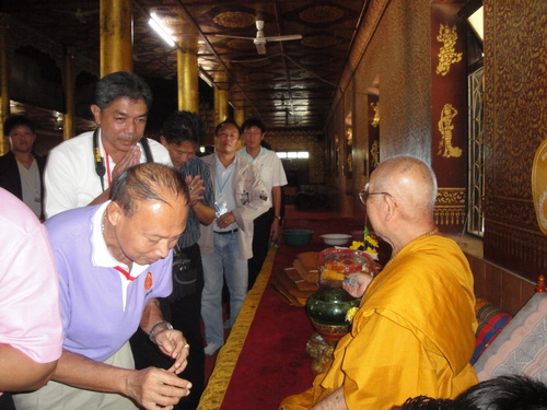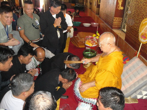 8222. พระรัตนรังษี หรือ พระครูบาแสงหล้า ธมฺมสิริ เจ้าอาวาสวัดพระธาตุสายเมือง เวียงท่าขี้เหล็ก สหภาพเมียนมาร์ ประพรมน้ำมนต์เพื่อเป็นศิริมงคลแก่ คณะ พคบ.301